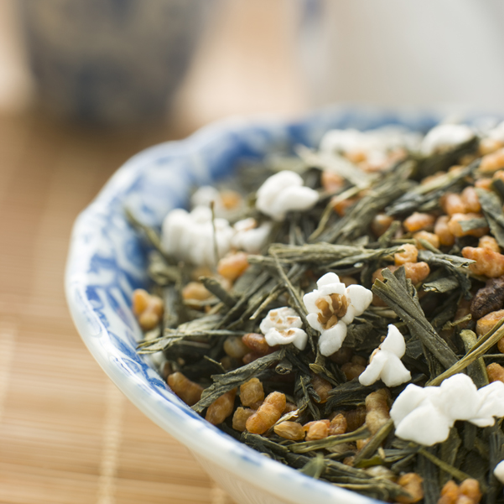 The combination of green tea and roasted brown rice is popularly called popcorn tea because a few grains of rice pop during the roasting and turn the mix into something festive.  In the beginning, my favorite morning potion was imbibed by poorer Japanese, the rice serving as a filler and reducing the cost of the tea in local shops. Genmaicha was once known as the "people's tea", but today it is loved and consumed in vast quantities by all classes of society.